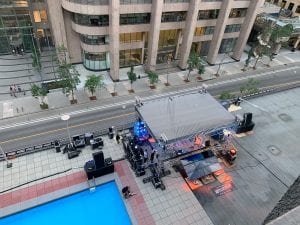 No sooner had we checked in at the pre-arranged time (staggered check-in to prevent the risk of transmission) and walked into our room when two highly-efficient, super-friendly, and masked hotel staff rolled in a cart of food and beer and set it on our table. Good god, the hospitality suite on the ninth floor (our room) is one of the biggest hotel rooms I’ve ever been in. It’s nearly as big as our house in Kensington.The only downside to watching the concert from our balcony was the tempting pool seven stories below. I don’t know if you’ve ever seen that scene in Get Him To The Greek when Aldous Snow jumps into the pool, but that looked so cool, and it looks deep enough. 5’ is deep enough, right? Oh wait, Aldous was only one story up, and didn’t he smash his arm and nearly bleed to death in the pool? Nevermind, I’ll just stand here and try not to get vertigo.