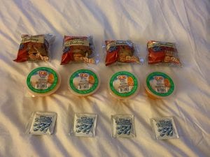 The food is not bad for the most part, and the menu keeps every meal interesting with the exception of breakfast. Breakfast is essentially a box of sugar. I’m using its contents to mark the number of days I’ve been 'in the joint'. If we were allowed any human contact at all I could trade muffins, fruit cups, and wet naps for protection, or use it to lord over the other ‘detainees’, and become the Shot Caller at the Ramada Hotel, the Ramada Don, if you will.