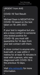 URGENT from AHS * COVID-19 Test Result: * Michael Dean is NEGATIVE for COVID-19 based on the test taken 16-JAN-2021.